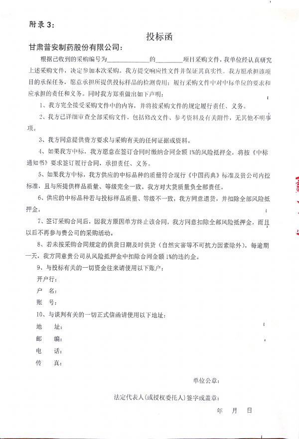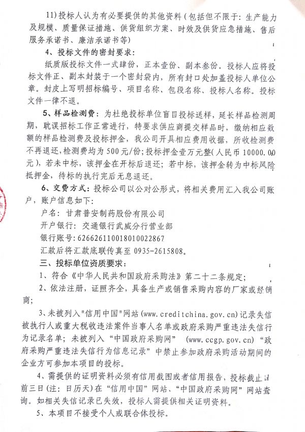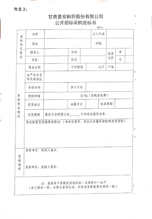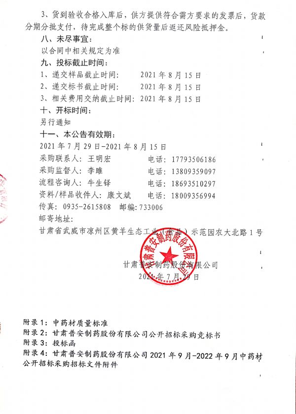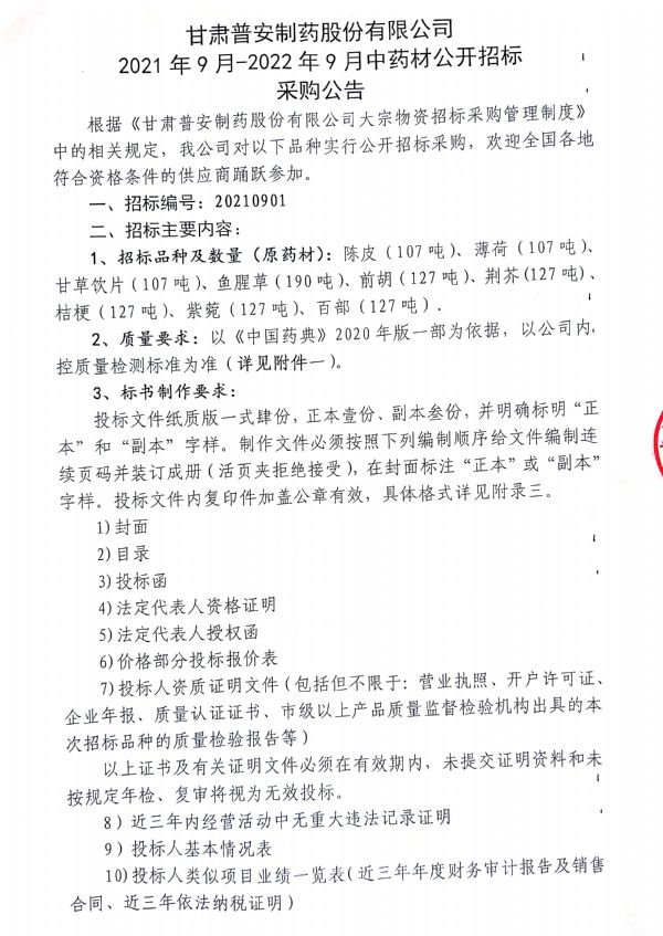 甘肅普安制藥股份有限公司 2021年9月-2022年9月中藥材公開招標采購公告