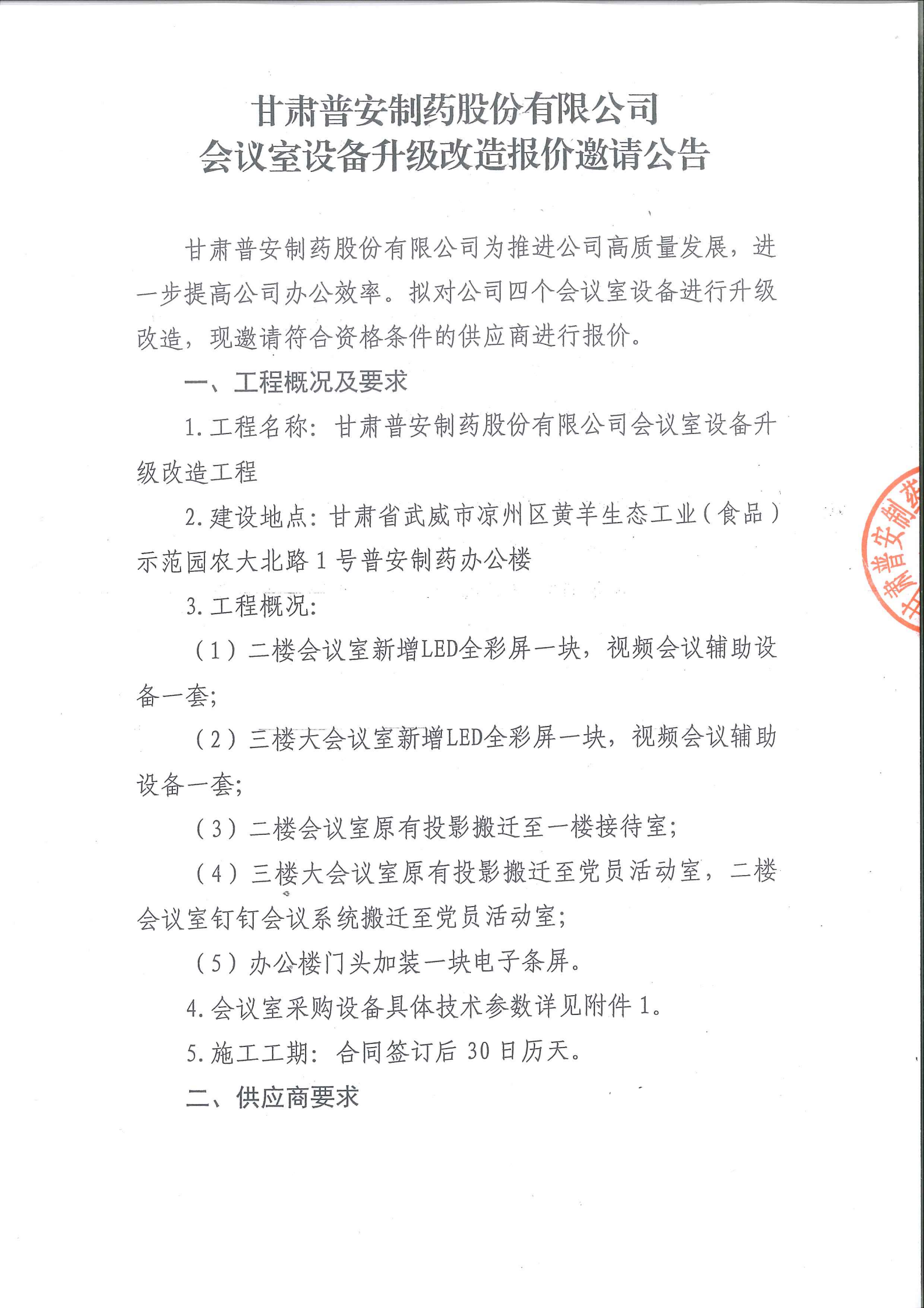 甘肅普安制藥股份有限公司會(huì)議室設(shè)備升級(jí)改造報(bào)價(jià)邀請(qǐng)公告