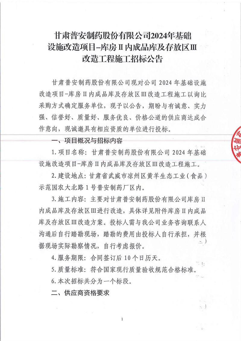 甘肅普安制藥股份有限公司2024年基礎(chǔ)設(shè)施改造項目-庫房Ⅱ內(nèi)成品庫及存放區(qū)Ⅲ改造工程施工招標(biāo)公告