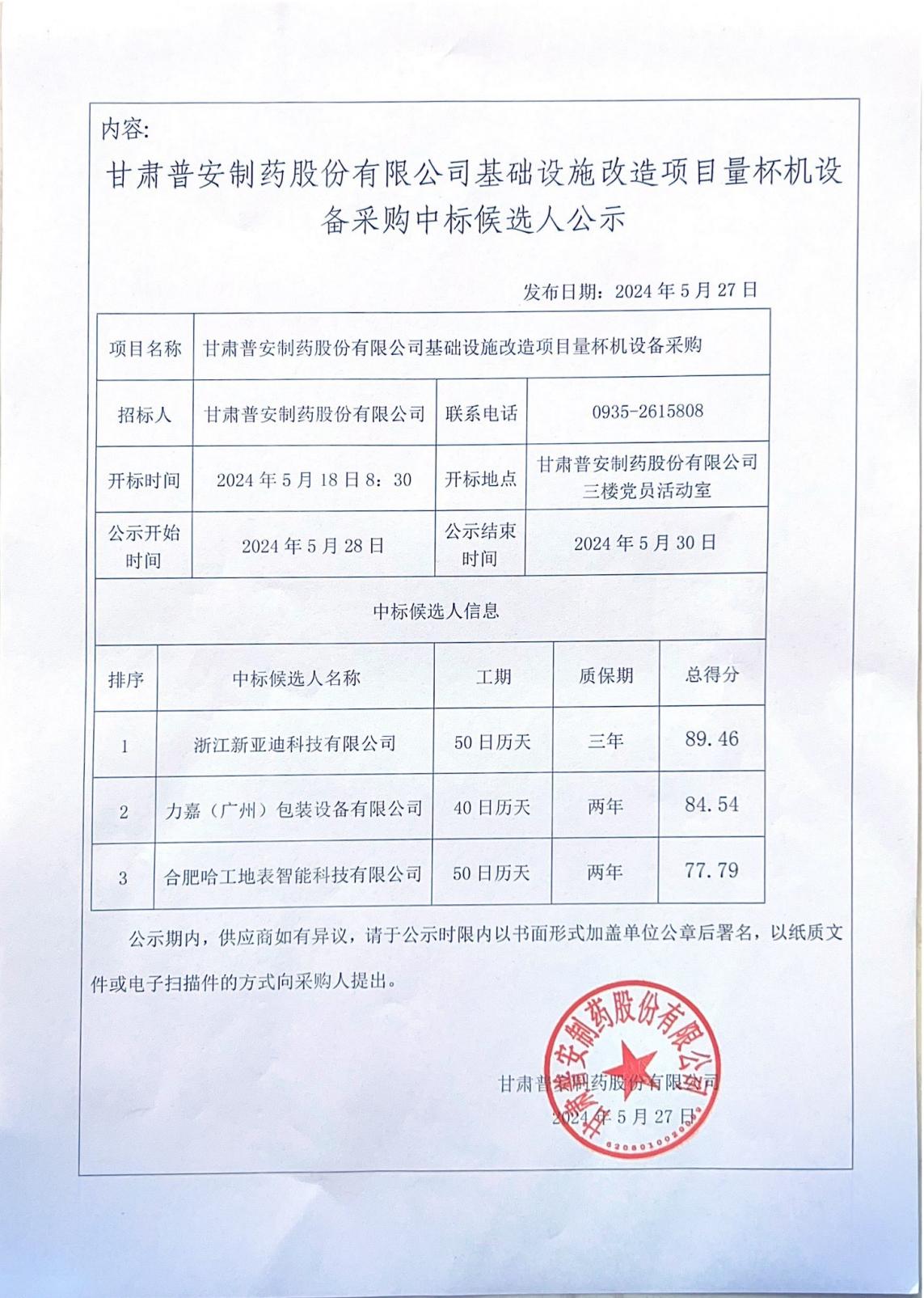 甘肅普安制藥股份有限公司基礎設施改造項目量杯機設備采購中標候選人公示