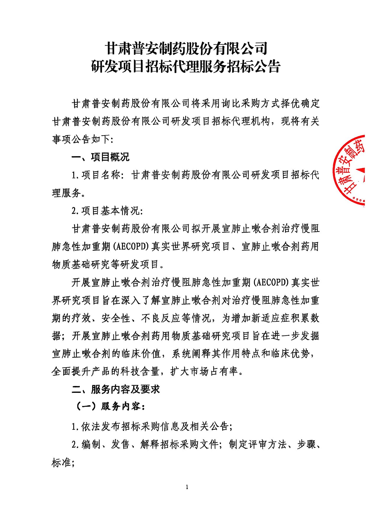 甘肅普安制藥股份有限公司研發項目招標代理服務招標公告